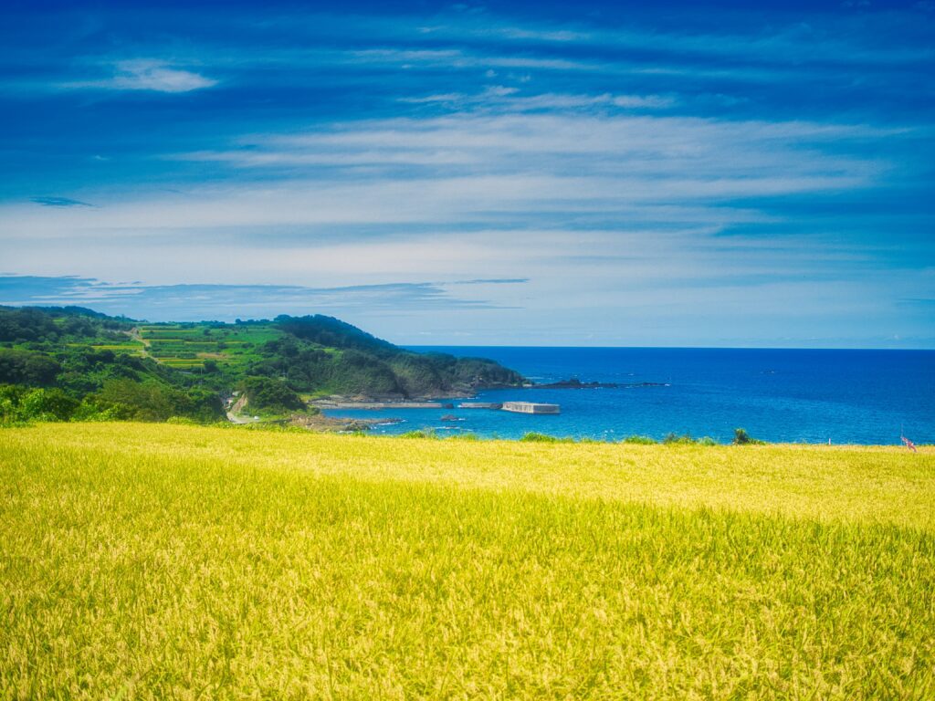 佐渡島での田んぼの先に広がる日本海。田んぼの目の前に海が広がる光景も素敵です。
