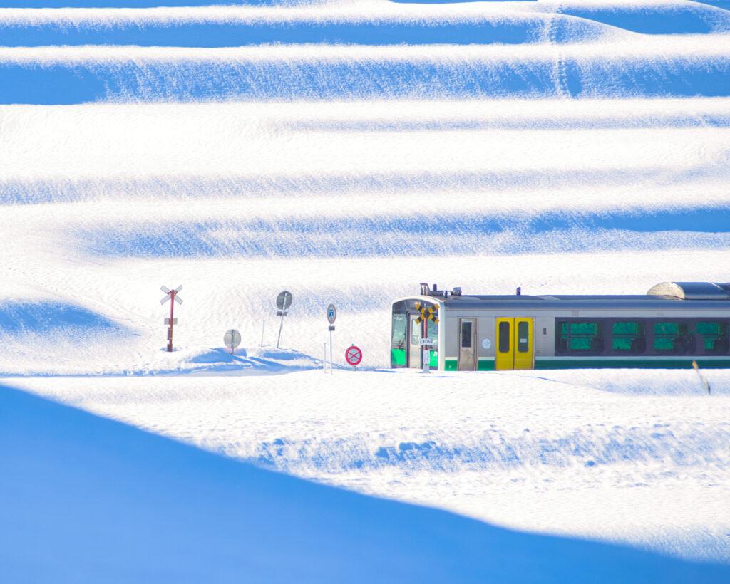 踏切の周りは、一面真っ白な雪景色の為、曇の日はおそらくのっぺりとした景色。訪れるなら太陽が顔を出す晴れた日がおすすめ!!